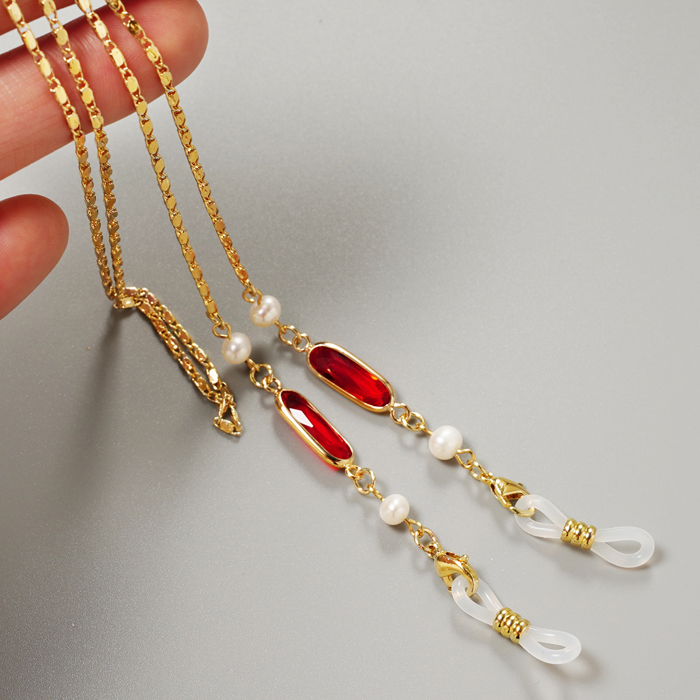 See video JH-29 Stainless steel eyewear chain with hanging rope, anti drop chain for vintage glasses (single sided four leaf pearl) $ Login See options